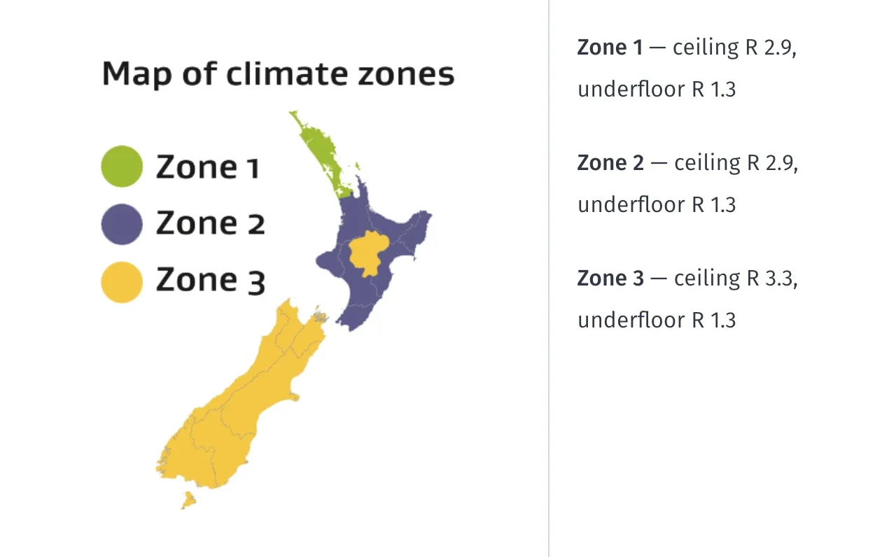 Know your climate zone. Minimum insulation requirements vary by region. The North Island and South Island zones have different R-value expectations.